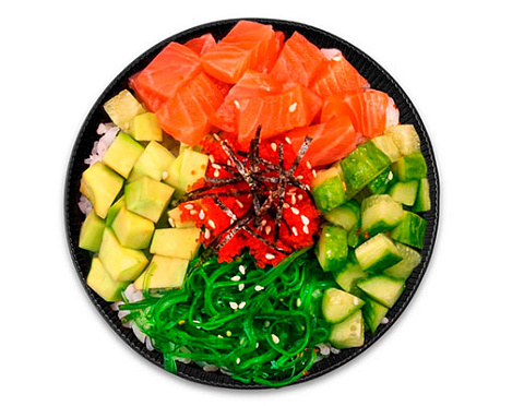 Лосось, свежий огурец, авокадо, чука, икра масага, нори, кунжут, соус ореховый, соус яки.