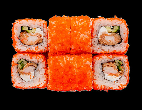 Креветка в темпуре, сыр творожный, огурец, икра масага.