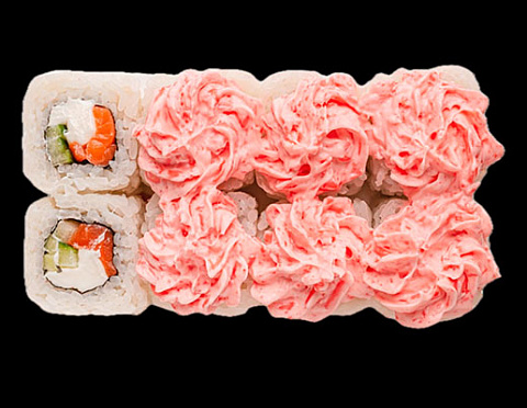 Лосось, творожный сыр, нежный соус «Лава», огурчик.