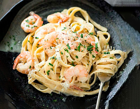 Паста фетучини, тигровые креветки, ветчина, сыр пармезан, сливки, сливочно-чесночное масло, специи, зелень.