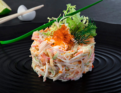 Снежный краб, свежий огурчик, авокадо, пекинская капуста, томат черри, салат «Романо», зеленый лук, икра «масаго», перепелиное яйцо, японский майонез.