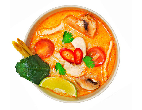 Филе куриное, тонкая тайская лапша, шампиньоны, томаты черри, паста том-ям, лемонграсс, специи, сливки, зеленый лук, кинза, лайм.