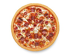Салями, окорок, охотничьи колбаски, шампиньоны, маринованный огурчик, острый перец «халапеньо», сыр «моцарелла», фирменный томатный соус, зелень.