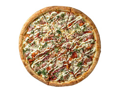 Ветчина, курица, шампиньоны, помидоры, сливочный соус ,сыры : «моцарелла» и «пармезан», соус «чесночный ранч».