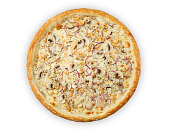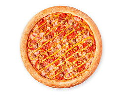 Ветчина, бекон, пикантная колбаса пепперони, куриная копченая грудка, кусочки свинины, соус томатный, приправа для пиццы, соус 1000 островов, лук фри.