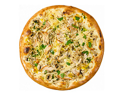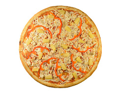 Копченая курца, болгарский перец, ананас, сыр «моцарелла», фирменный томатный соус, зелень.
