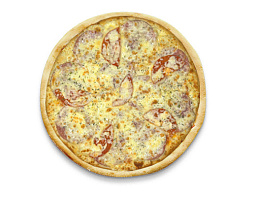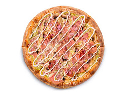 Ветчина, бекон, шампиньоны, маринованный лук, сливочный соус, сыр моцарелла, пармезан, чесночный соус, приправа для пиццы.
