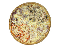 Ветчина, салями, шампиньоны, маринованный огурчик, помидоры, сыр «моцарелла», фирменный томатный соус, зелень.