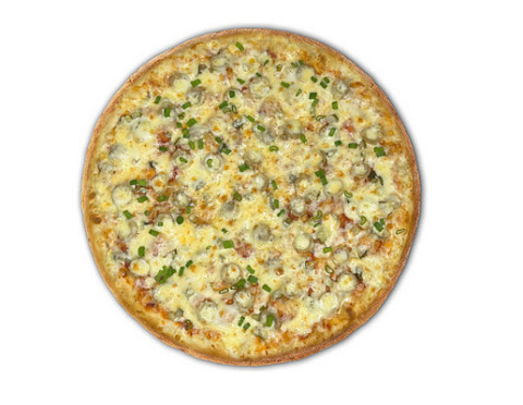 Курица, сосиски куриные, маринованный огурчик, фирменный томатно-сливочный соус, сыр «моцарелла», зеленый лук.