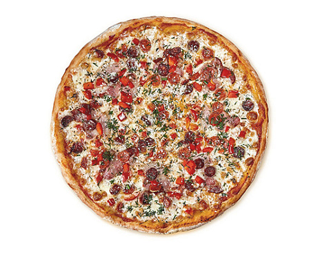 Копченая курица, кусочки маринованной свинины, охотничьи колбаски, маринованный огурчик, помидоры сыр «моцарелла», фирменный томатный соус, зелень.