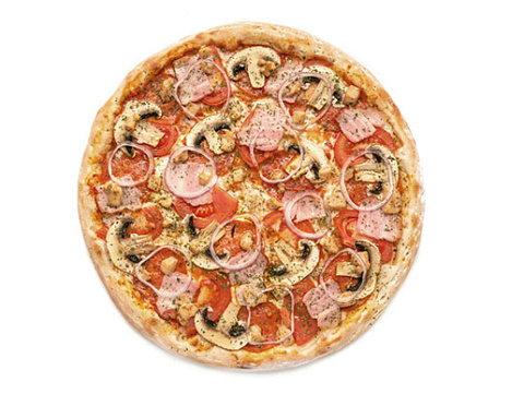 Окорок, шампиньоны, маринованный лук, помидоры, сыр «моцарелла», фирменный томатный соус, зелень.