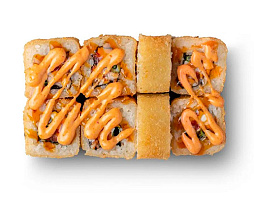 Тигровая креветка, спелый авокадо, нежный крем – краб, острый соус «Шрирачи», кляр , панировка.