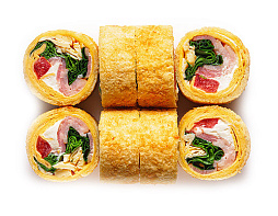 Копченая курочка, сочный томат, свежий огурчик, творожный сыр, японский омлет «Томаго», кляр, панировка.