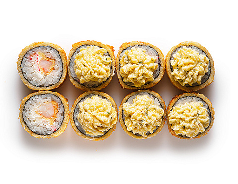 Креветка в кляре, нежный крем –краб, творожный сыр, соус из сыра «Пармезан», кляр, панировка.