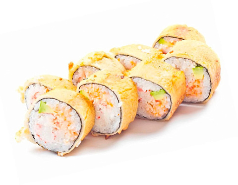 Тигровая креветка, спелый авокадо, нежный крем – краб, острый соус «Шрирачи», кляр , панировка.