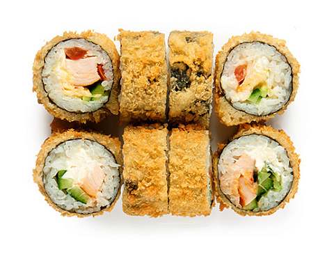 Копченая курочка, сочный томат, свежий огурчик, творожный сыр, японский омлет «Томаго», кляр, панировка.