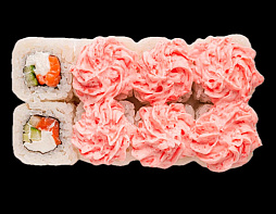Тигровая креветка, творожный сыр, свежий огурчик, зеленый лук, островатый соус из филе лосося «Вулкан».