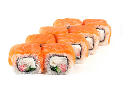 Ролл обернутый филе лосося со свежим огурчиком, творожным сыром и икрой лосося.