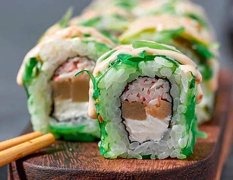 Нежный крем – краб, японский омлет «Томаго», творожный сыр, водоросли «Чука», ореховый соус, кунжут.