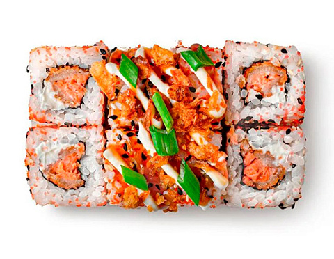 Лосось в кляре, творожный сыр, икра «Масаго», соус «Спайси», соус «Унаги», лук фри, зеленый лук, кунжут.