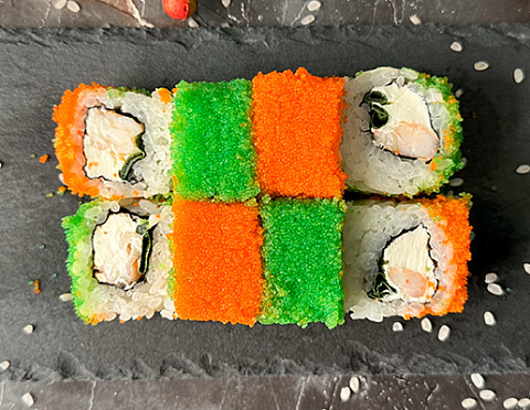 Тигровая креветка, творожный сыр, зеленый лук, острый соус «Шрирачи», ассорти из икры «Масаго».