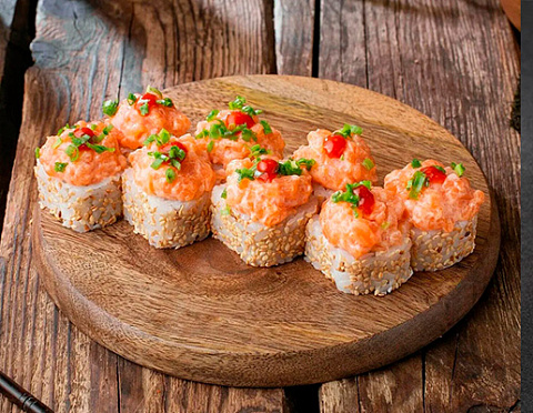 Тигровая креветка, творожный сыр, свежий огурчик, зеленый лук, островатый соус из филе лосося «Вулкан».