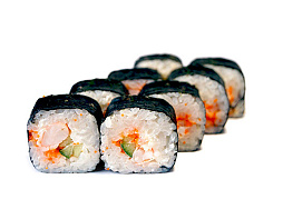 Креветка в кляре, икра масаго, творожный сыр, огурец.