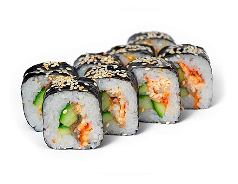 Угорь, огурец, кунжут, соус унаги.