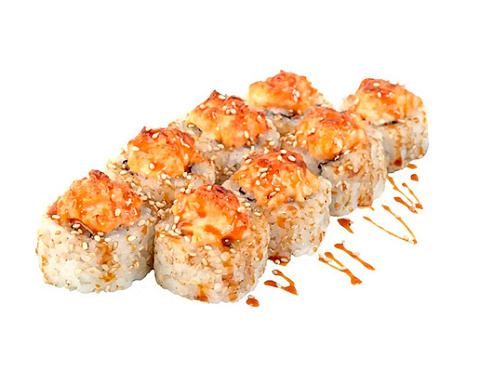 Тигровая креветка, нежный крем – краб, свежий огурчик, острый соус «Шрирачи», жареный кунжут, соус «Унаги», сырно – чесночная шапочка.