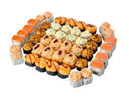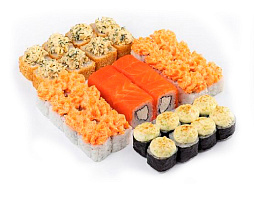 Филадельфия с луком, калифорния с лососем, лава с жареным лососем, темпура с угрем, окинава, сяке маки, каппа маки (56 шт.)