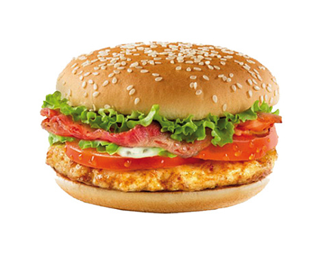 Булочка, куриная котлета, микс салата, свежие томаты, копченый бекон, лук фри, чесночный соус, майонез.