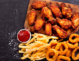Острые куриные крылышки « Баффало» (130 гр.) куриные крылышки в панировке (130 гр.) картофель фри (100 гр.) томатный соус
