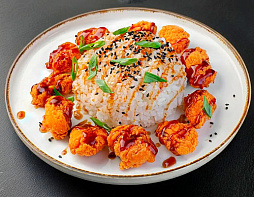 Хрустящие куриные кусочки в панировке, пряный рис, соус терияки, кунжут, зеленый лук.