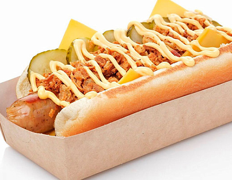 Булочка, сосиска, сыр чеддер, сыр гауда, огурец маринованный, лук фри, соусы: сырный, чесночный и медово-горчичный.